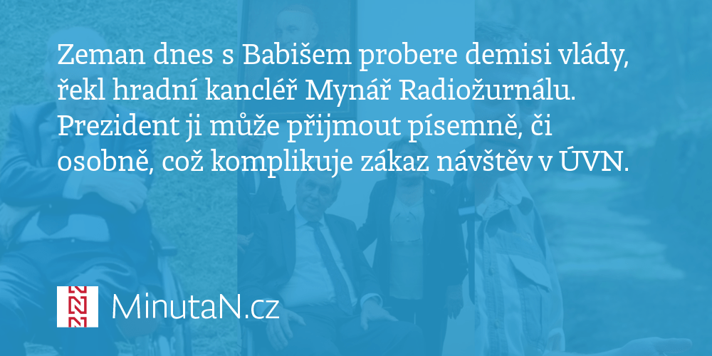 Hlava státu podle ústavy pověřuje vládu, jejíž demisi přijala, výkonem funkce až do jmenování nového kabinetu.. Hradní mluvčí jiří ovčáček přitom ještě minulý týden uvedl, že státníci se shodli na osobním setkání. Demisi vlády plánuje končící premiér prezidentovi písemně odevzdat okamžitě po skončení ustavující schůze poslanecké sněmovny. Shodli se, že se chtějí setkat osobně, považují to za vhodnější než telefonát a videokonferenci, uvedl hradní mluvčí jiří ovčáček. Prezident miloš zeman přijal demisi vlády premiéra andreje babiše (ano), informoval o tom mluvčí hradu na twitteru.. Prezident republiky a premiér se shodli, že se chtějí setkat osobně, považují to vhodnější než telefonát nebo videokonference.